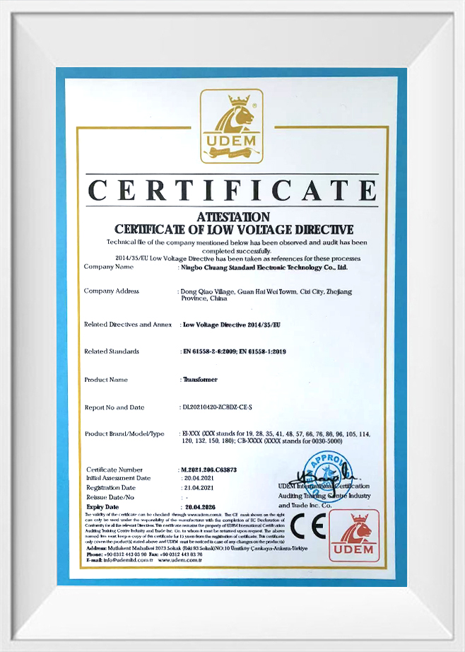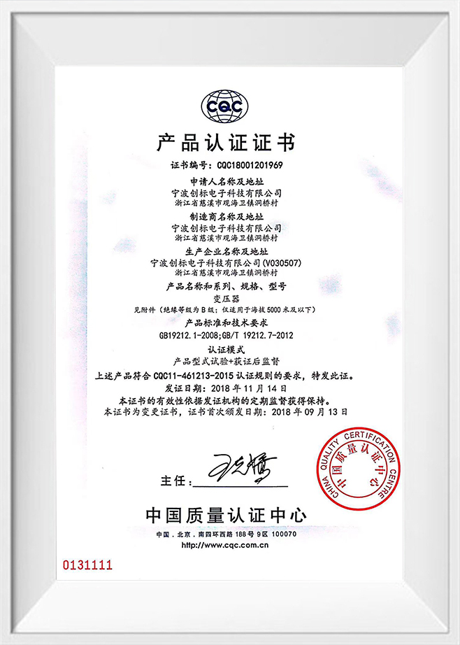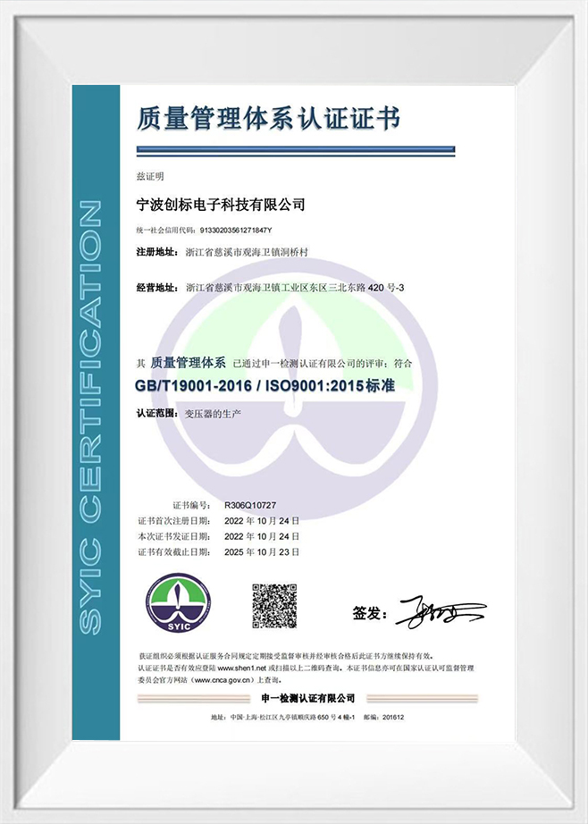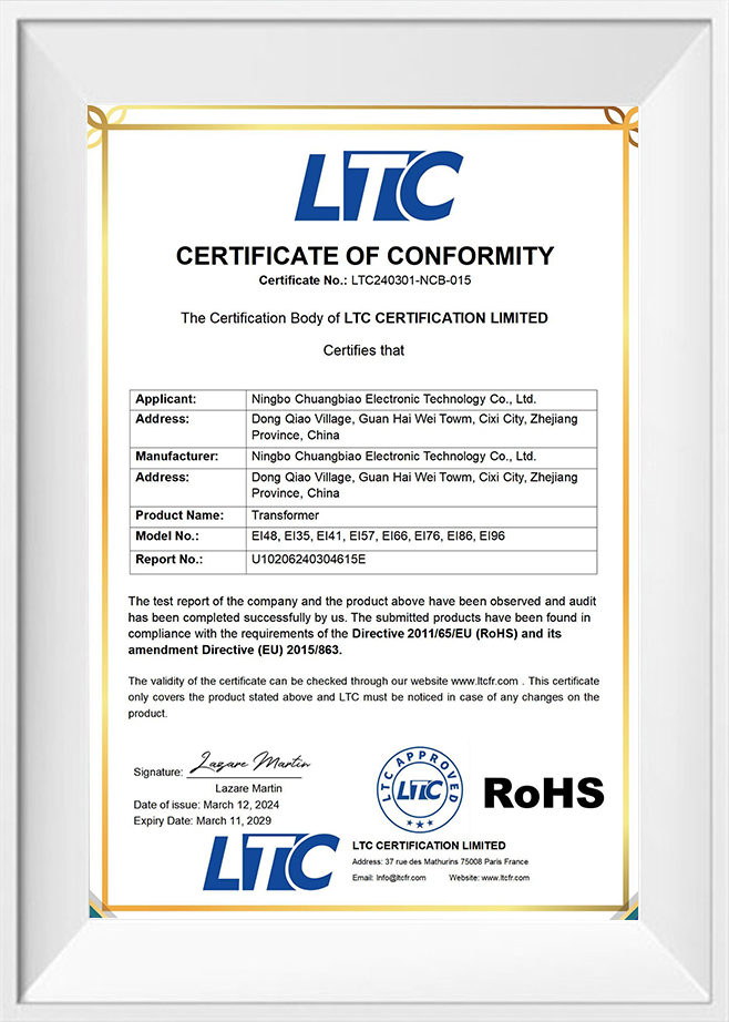 Ningbo Chuangbiao Electronic Technology Co., Ltd. Przeprowadził Ścinałą Kontrolę Jakości i Testowanie na Każdym Transformatorze typu pin, aby upewniić się, Że Produkt ma Doskonaałą WydajnOśić i niezawodnotymić po opUzcnieniu. Fabryki. Firma prZestrzega Wymagan Systemu Zarządzania Jakością ISO 9001, ABY ZAPEWNI, Że Każdy Link W procesie Produksyjnym Spalnia Międzynarodowe Standard. Ponadto Produkt Jest ROwnież Zgodny Z CertyfikaCją Ochrony Środowiska Rohs I Spelnia międzynarodowe Standardowe Ochrony Środowiska, OdzwiercidlaJąc nacisk Firmiron ęSRodowisha.